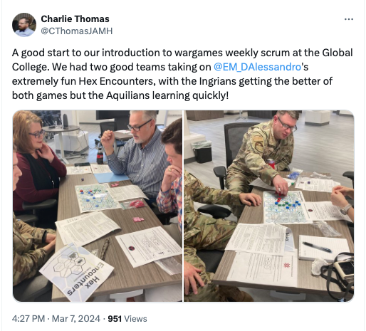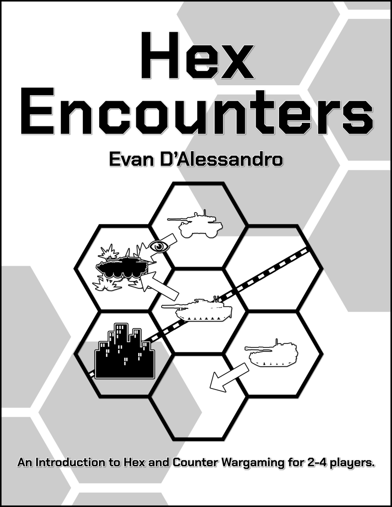 Hex Encounters is an introduction to hex and counter wargames designed to be the simplest possible game that can include all of the standard features of a hex and counter wargame. It takes 1 hour to play for 2-4 players.
