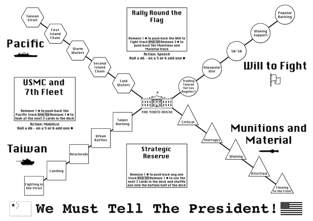 We Must Tell the President! is a 10-minute educational game about a war between the US and China over Taiwan tomorrow. The game is designed to be simple and straightforward for relatively uninitiated wargame players and to educate the player on some of the important factors for such a war.